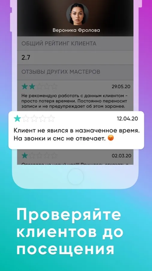 Мастера использующие Мой Профи в своей работе получают не только возможность быть ближе к новым клиентам, но и мобильный CRM инструментарий для эффективного управления текущей клиентской записью, хранения данных о клиентах и историй посещений, систему напоминаний, отчеты о доходах и расходах, программы лояльности и многое другое, что позволяет существенно сэкономить рабочее время и автоматизировать текущие рабочие задачи.