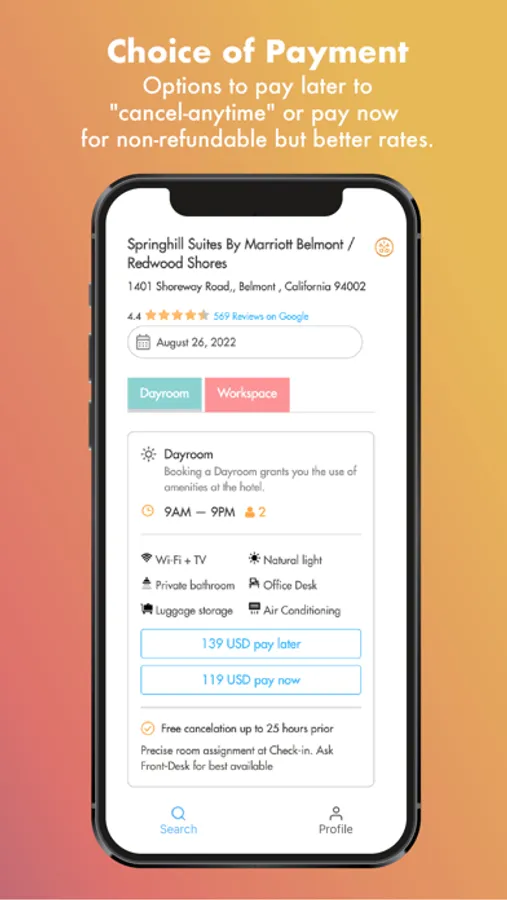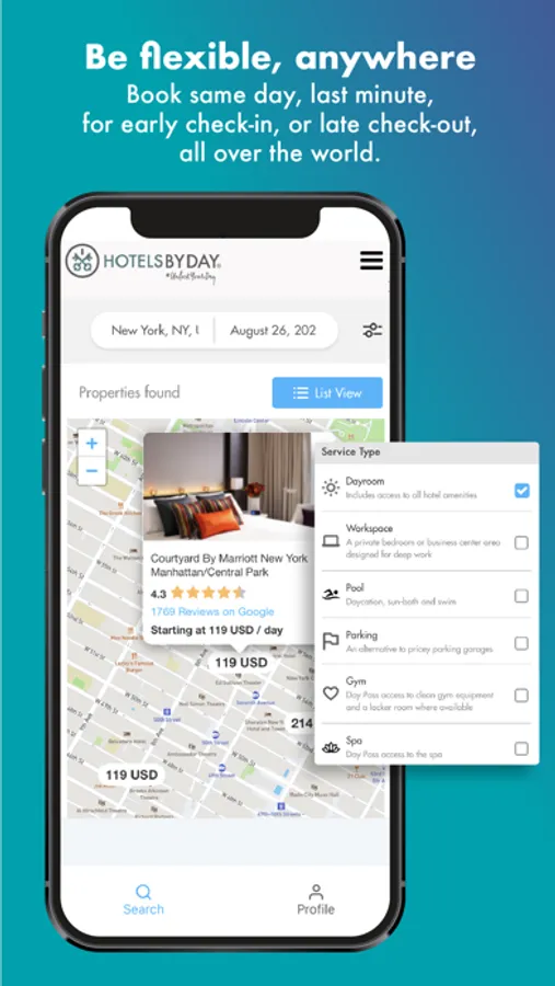HotelsByDay give you flexibility, comfort, and a space of your own—by day. Booking doesn’t require a credit card, and you can do it in three simple clicks. Hotels post their unused day space here; you browse the offerings, and book a room. Then, you check in as usual—and use the space to nap after a redeye, prepare for an event, host meetings, or simply relax. Elegant and convenient, HotelsByDay allows you to focus on having a beautiful time. Specific uses: