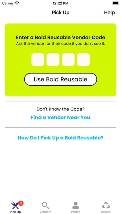 Visit participating vendors for takeout, open the Bold Reuse app and enter the four digital vendor code.