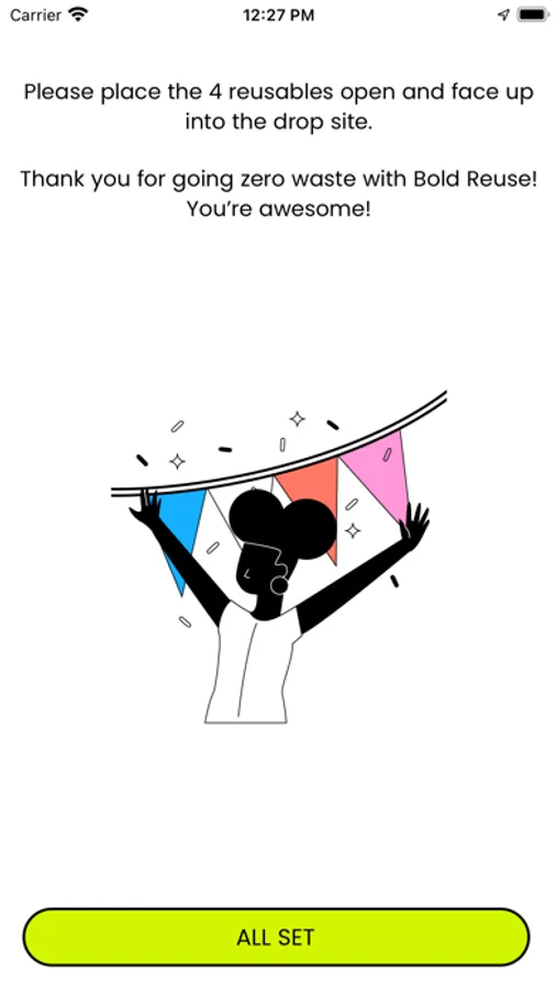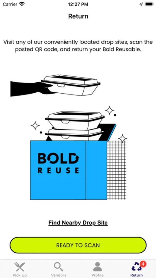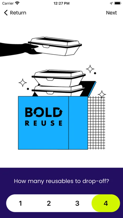 Find a nearby Bold Reuse drop site. Open the Bold Reuse app and scan the QR code on the drop site and drop the reusable inside.
