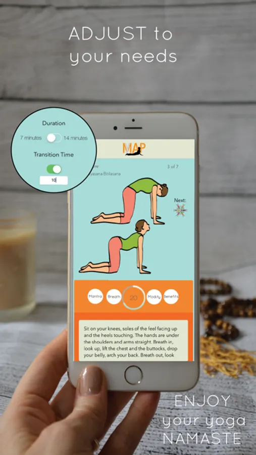 YogaMap is set up to do yoga anywhere anytime. No need to choose, change, pick or think. Each yoga session is different, but takes you through class in a similar way: