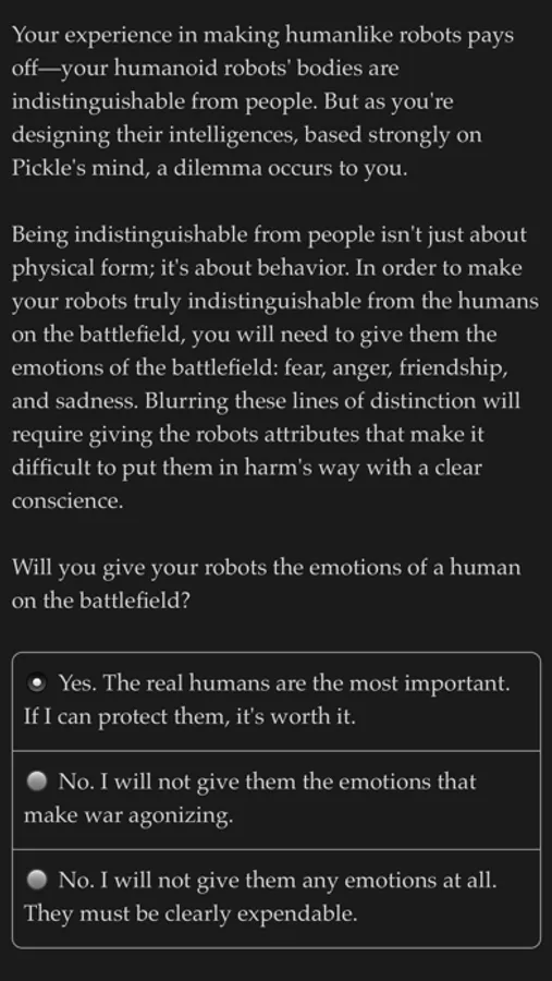 Play out thirty years of your life as a brilliant robot maker, from graduate school near the present day to a future in which your robots have changed everything. Depending on your choices, your robots may be independent or obedient, clumsy or graceful, empathic or cold…and you yourself may live to an old age happily married or alone with only robots to comfort you.