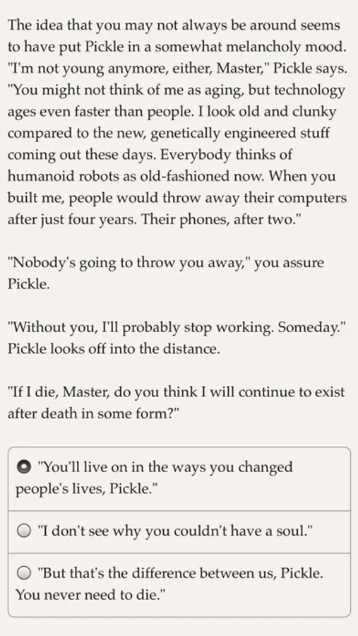 "Choice of Robots" is an epic 300,000-word interactive sci-fi novel by Kevin Gold, where your choices control the story. It's entirely text-based—without graphics or sound effects—and fueled by the vast, unstoppable power of your imagination.