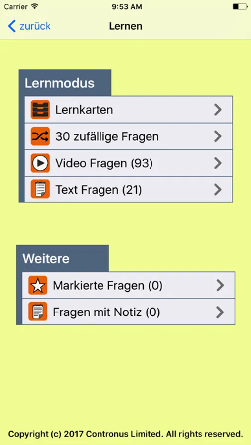 Erarbeite den offiziellen Katalog durch verschiedene Lern Modi: Lerne Fragen entweder nach Themengebiet sortiert, nach dem Leitner Lernkarten-Prinzip, nach Zufallsprinzip oder unter den realen Bedingungen einer Prüfung.