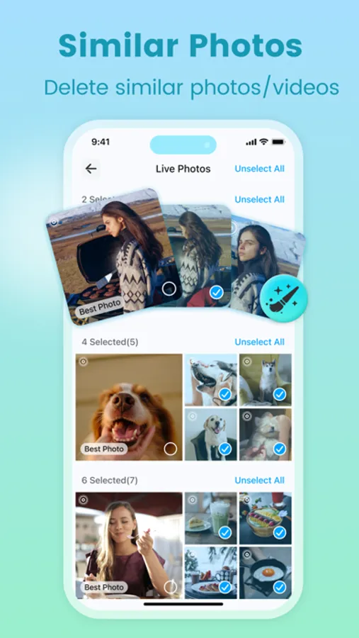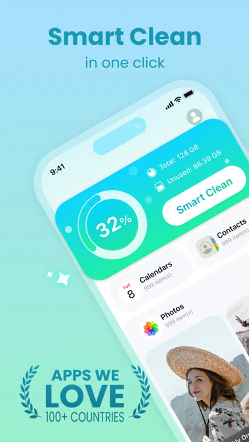 - Smart cleaning includes: screenshots, similar pictures, duplicate pictures, similar videos, duplicate videos, duplicate contacts and expired calendars