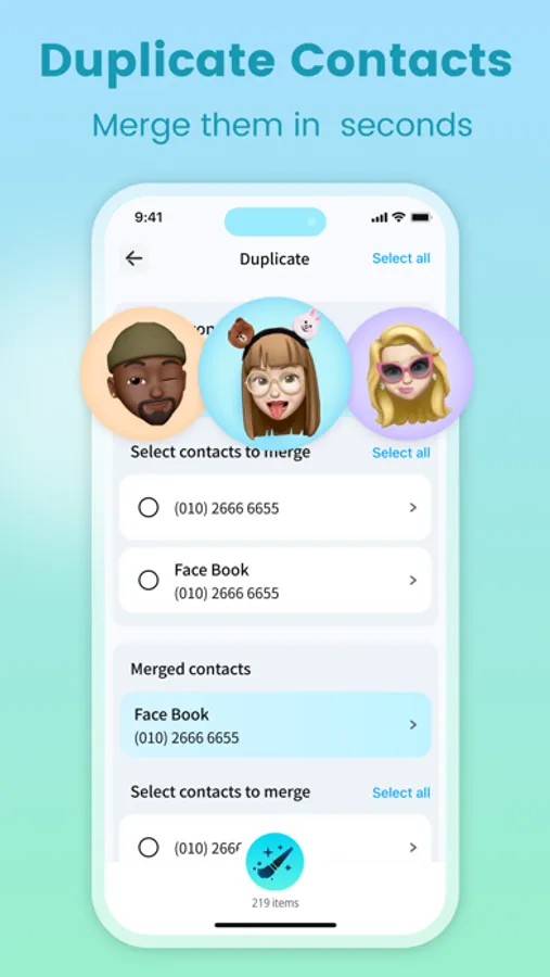 1. Enter the “Contacts Clean” page, scan the contacts and sort them by duplicate contacts and incomplete contacts;