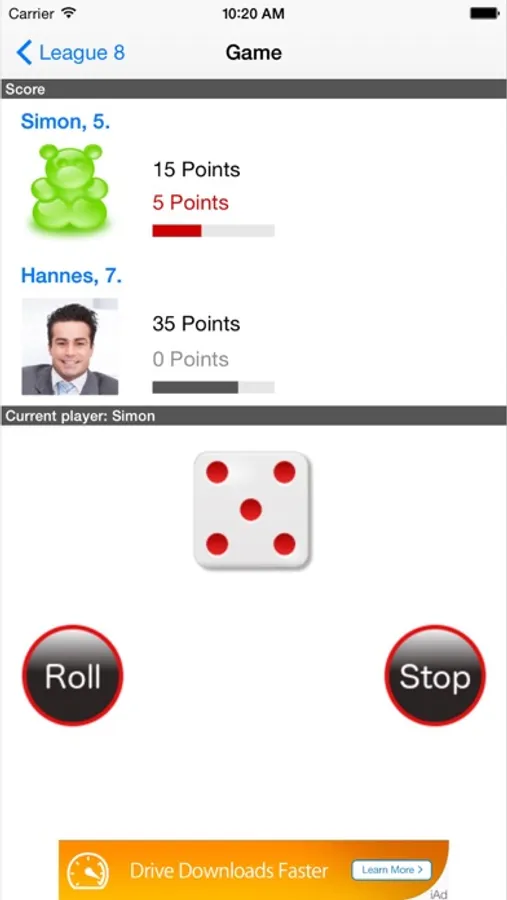 The game: There are always 2 players involved playing against each other with the objective of being the first one to gain 50 score points. For this, 1-5 spots of the dice are counted as score points, while throwing a 6 leads to deletion of all points scored in the current round, and it is then the turn of the opponent player.