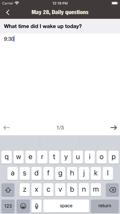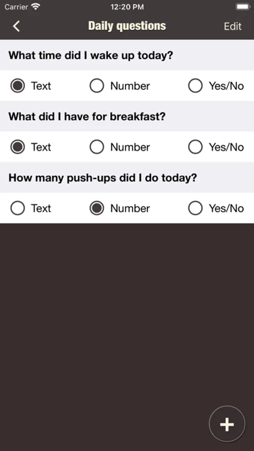 - You don’t need to answer all the questions at once. Instead, you can create a new entry by answering just one question from your current list of questions and then answer other questions one by one throughout the day by editing that entry. One can easily imagine using this app, for example, in a gym for writing down the results of each exercise (number of sets and repetitions) immediately after that exercise is done.