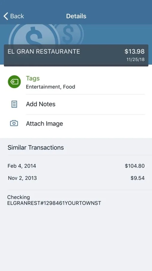 Add Tags, Notes, Images & Geo-Information: By enhancing transactions with custom tags, notes or photos of a receipt or check, you have the ability to stay organized and find exactly what you’re looking for when searching through your finances.