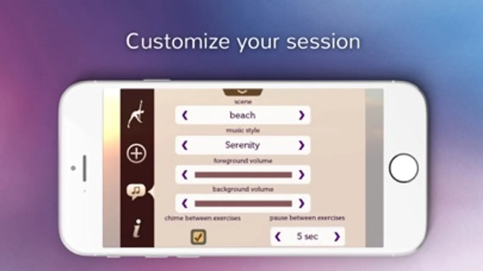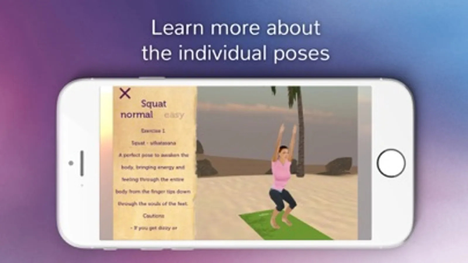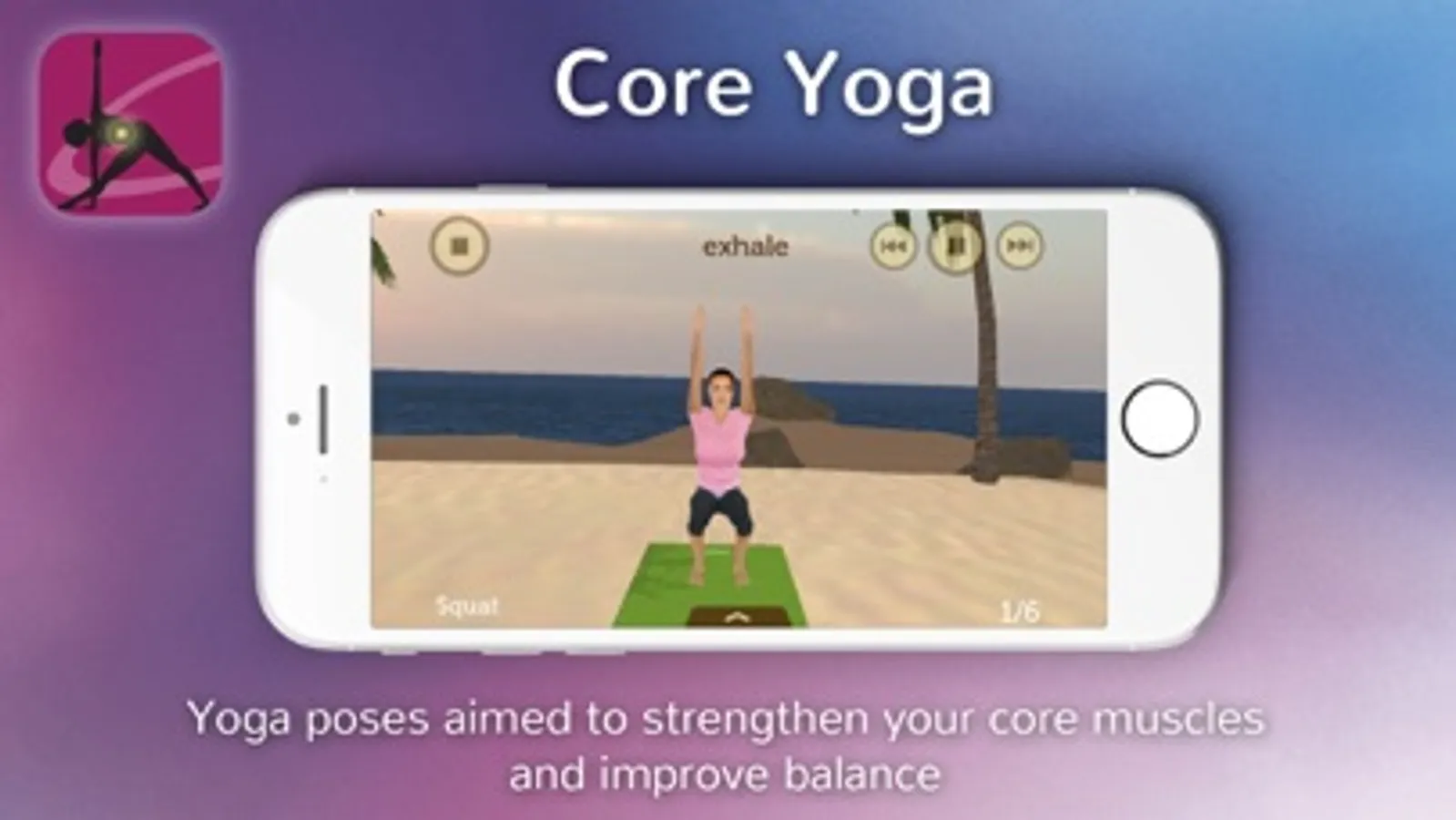 This app is not an encyclopedia of yoga poses, but rather a structured series of exercises designed to improve your core muscles and flexibility. The exercises are guided by musical cues that enforce the proper timing and synchronizes your movements with your breathing, the virtual yoga instructor provides visual cues eliminating the need for distracting voice overs so your exercise can be a truly mindful experience.