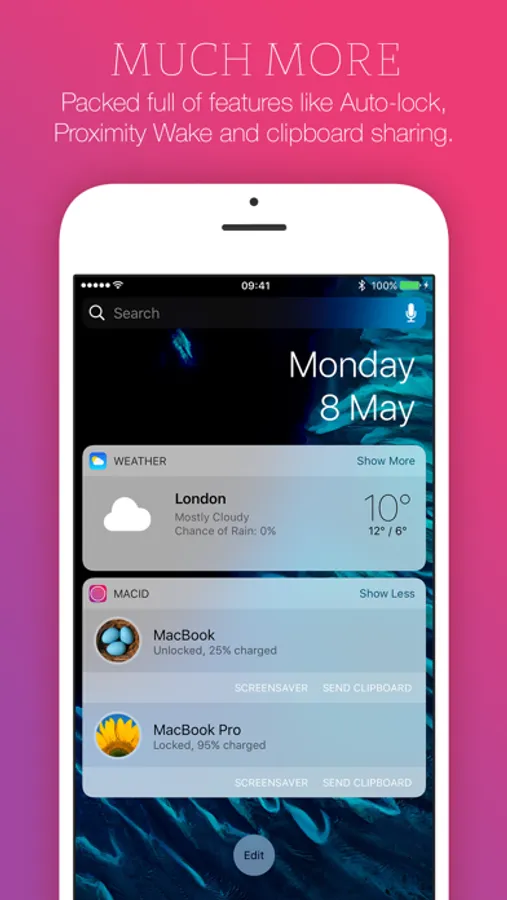 MacID includes a handy Notification Center widget, which will show all your currently connected Macs and give you quick access to lock and unlock them from anywhere on your iOS device. You can even start a Mac's screensaver or share the clipboard.