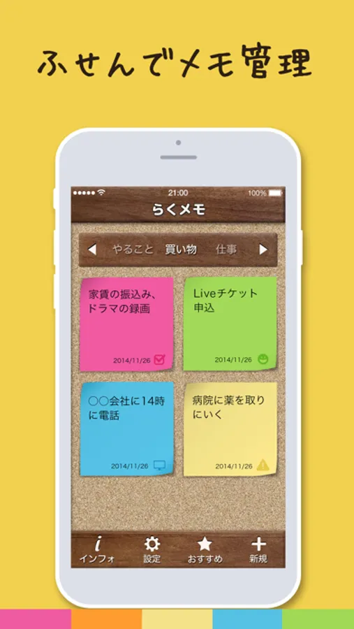 「やること」「買い物」「仕事」「プライベート」「急用」でメモをカテゴリ別に管理。