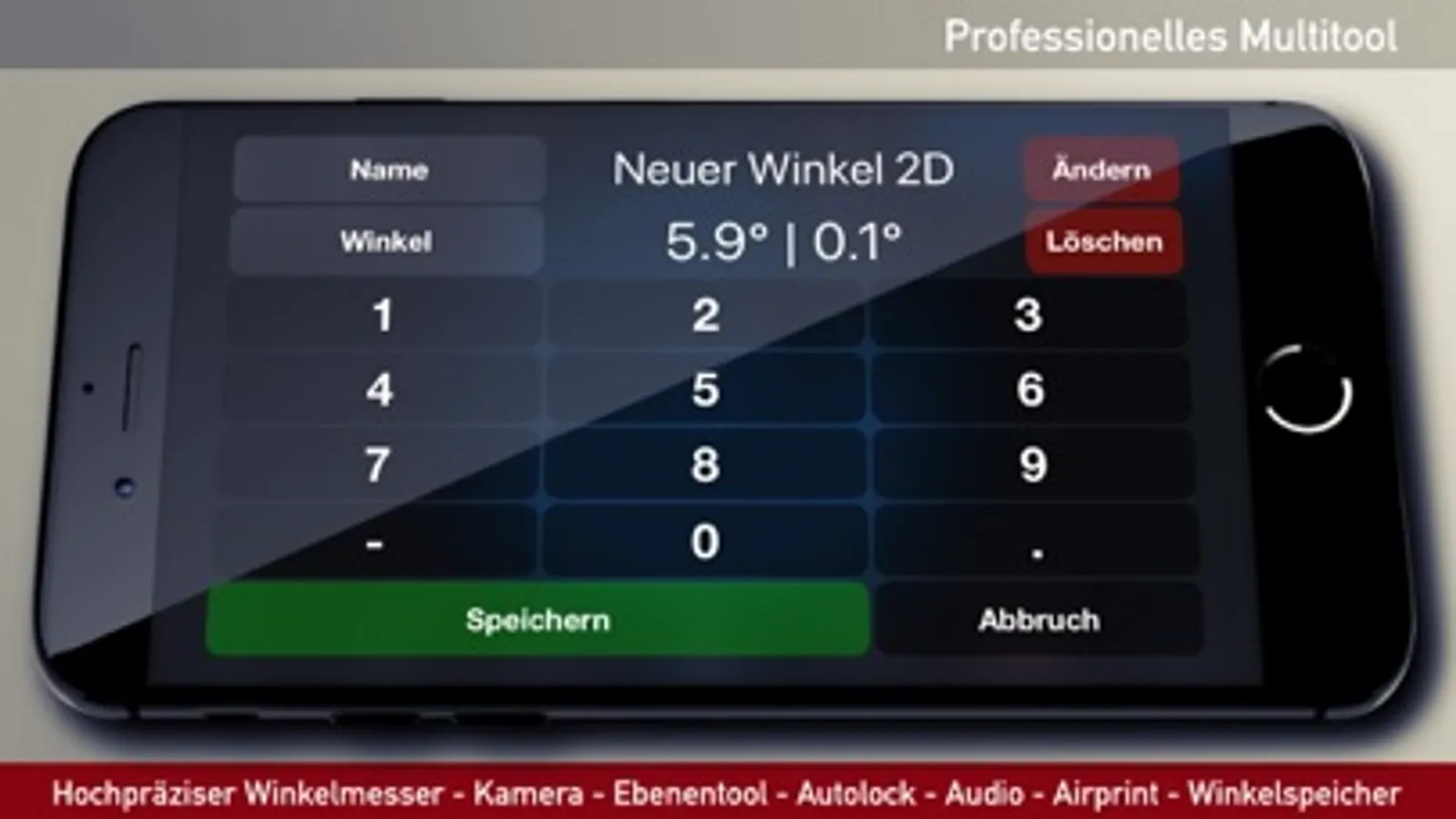 Use the clinometer the measure angles along all edges of your phone. You can set a target angle by moving your finger across the display. Additionally you can store up to 5 angles in the angle list and recall them quickly as target angles.