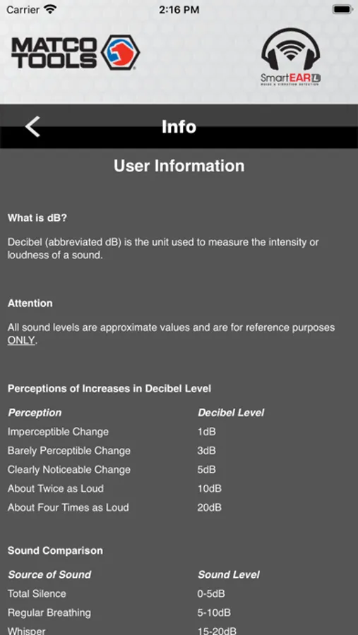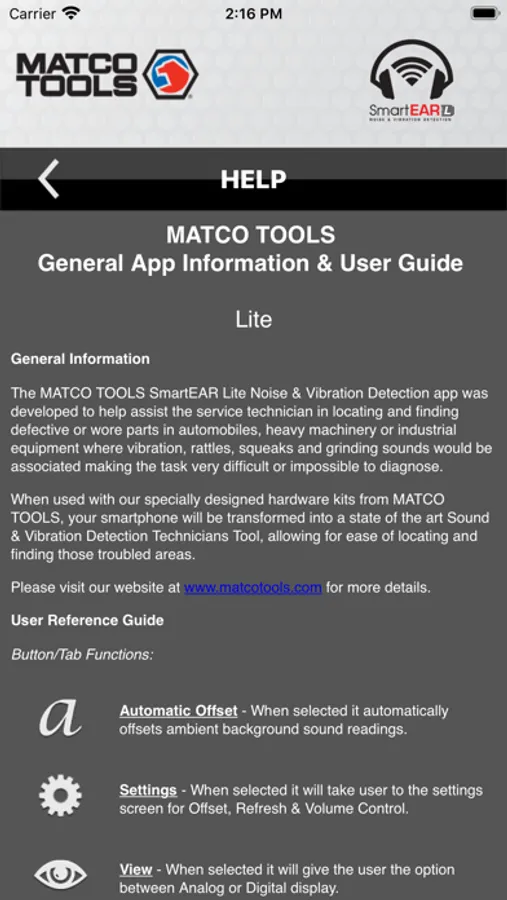 Developed for the service technician in mind, the Matco Tools SmartEAR LITE Sound & Vibration Detection app will assist in locating and pinpointing defective or worn parts in automobiles, heavy machinery or industrial equipment. When used to diagnose vibration, rattles, squeaks and grinding sounds, the SmartEAR LITE will simplify the task of locating and pinpointing the troubled area or part with ease.
