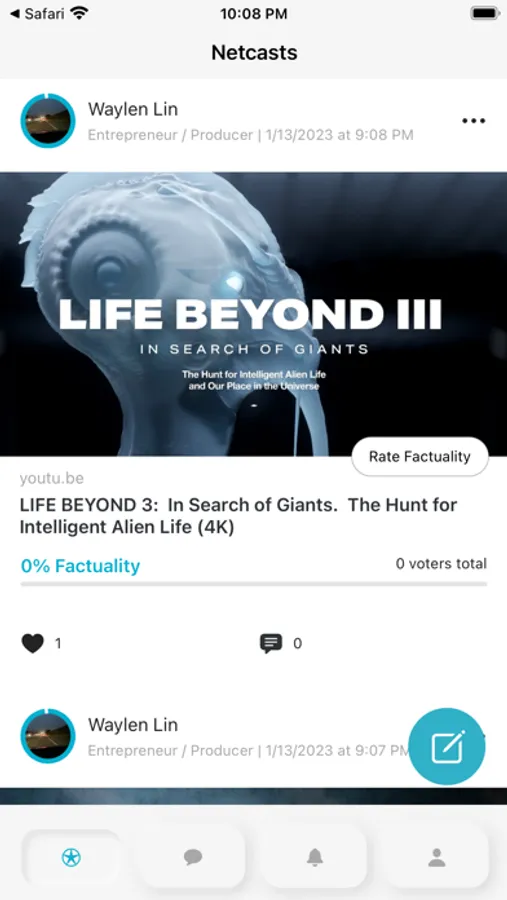 Use the Netcast to network and promote yourself while getting seen by fellow Netizaar “Netizens”— upload and netcast photos, videos, links, or just say, “hey!” The factuality ratings bar featured under each newslink lets you decide what’s worth your precious reading time. You can also participate in the factuality rating score to help bolster the quality of the News even more!! The Netcast is also a great place to discover other Netizens with high Netizaar scores!