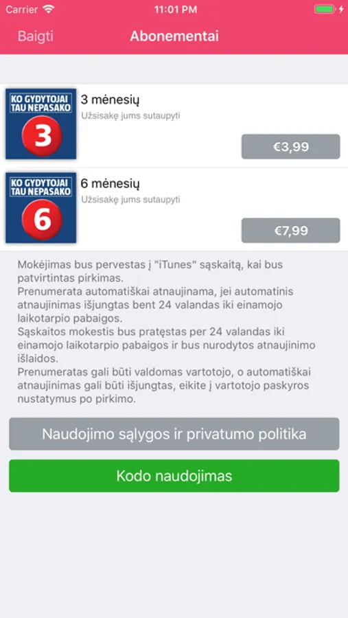 Mokėjimas bus pervestas į "iTunes" sąskaitą, kai bus patvirtintas pirkimas. Prenumerata automatiškai atnaujinama, jei automatinis atnaujinimas išjungtas bent 24 valandas iki einamojo laikotarpio pabaigos. Sąskaitos mokestis bus pratęstas per 24 valandas iki einamojo laikotarpio pabaigos ir bus nurodytos atnaujinimo išlaidos. Prenumeratas gali būti valdomas vartotojo, o automatiškai atnaujinimas gali būti išjungtas, eikite į vartotojo paskyros nustatymus po pirkimo.