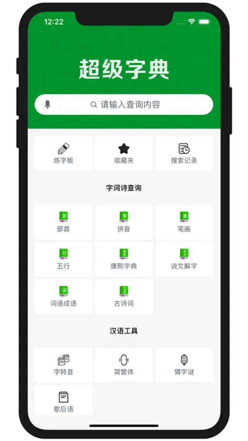 「超级字典」集全了现有的大部分汉语字典词典,其中包括新花字典、现代汉语大词典、现代汉语大字典、康熙字典、说文解字、国语辞典、国语小子典、古汉语字典、汉字源、汉字谜、歇后语、古诗词等常用字词典工具书籍。提供实用的汉字工具:汉字转拼音注音、汉字简繁体转换、造字、汉字笔顺动画等。支持手写输入汉字书法临摹练习。