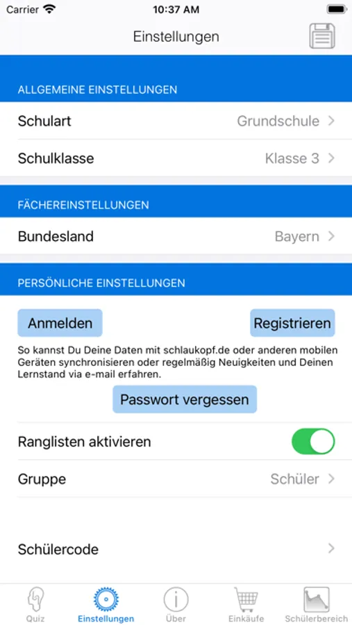 Egal, ob du in der Grundschule, in der Hauptschule, in der Realschule oder im Gymnasium bist, Du findest bei dieser App Fragen für alle Klassen und sehr viele Fächer. Egal, ob du größere Themen wiederholen willst oder dich auf etwas Neues vorbereiten willst, Schlaukopf kann dich hierbei prima unterstützen.