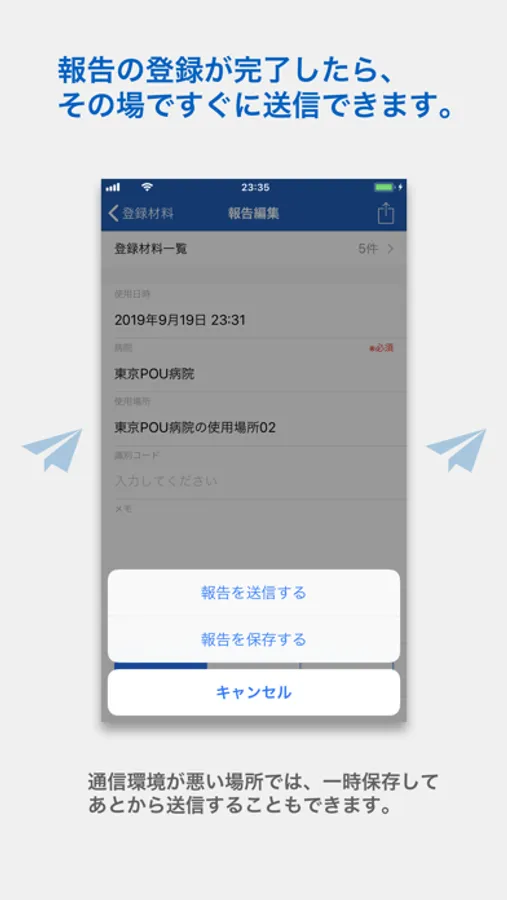 インターネットの使えない環境では報告をいったん保存しておき、次にネットワークに繋がった時点で送信できるので、現場の環境に合わせた使い方が出来ます。