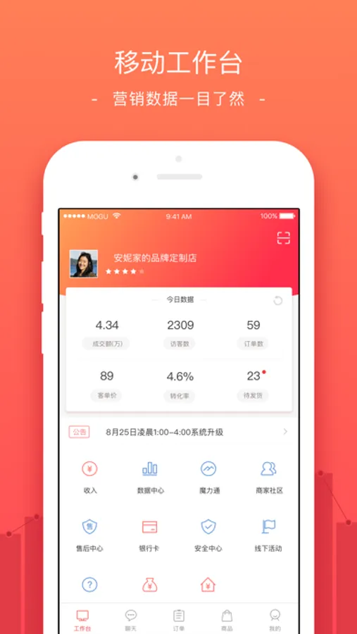 蘑菇街商家版,是由蘑菇街官方提供的商家店铺管理工具,致力于为商家提供更高效的工作方式,适合蘑菇街主站商家、蘑菇街主播、蘑菇街女装小程序等商家使用。