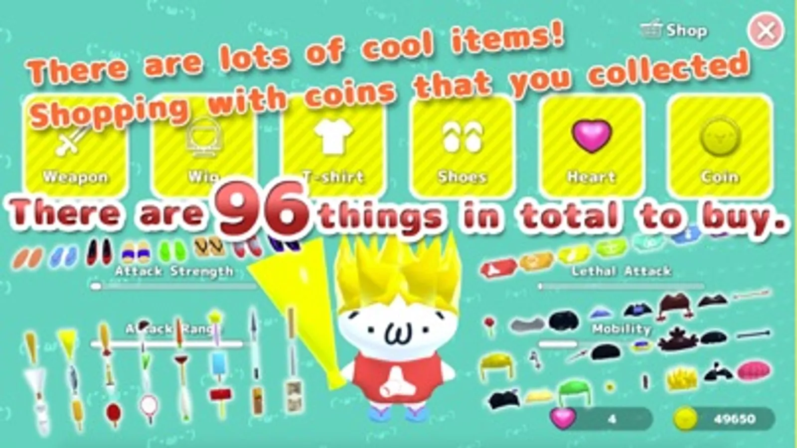 You can buy weapons, wigs, T-shirts, heart,and shoes at the shop.