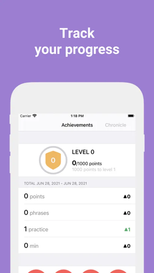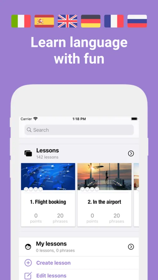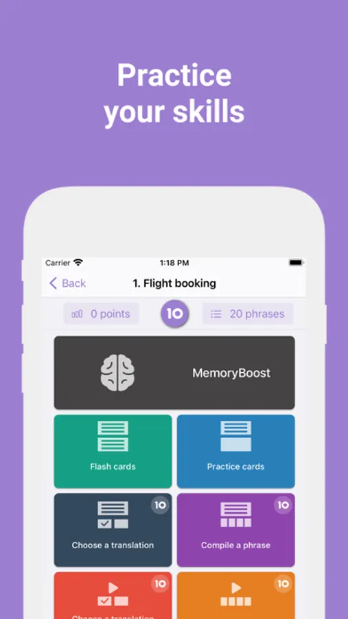 Our unique algorithm improves the learning process, using proven methods from the field of memory research. Phrases adapts individually to you, selectively repeats the material with which you had problems. Completing lessons and playing games, you will gain experience, move to higher levels and collect rewards.