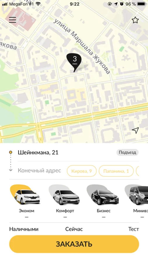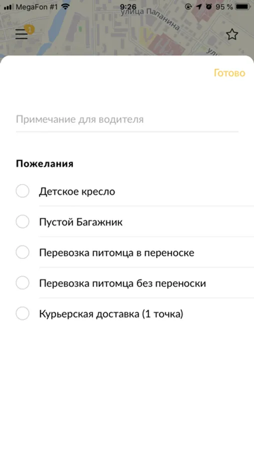 Нажав на звездочку в правом верхнем углу, Вы можете добавить маршрут в "Избранные", и в дальнейшем Вам больше никогда не придется вводить его вручную - просто нажмите на Звездочку и выберите нужный маршрут. При этом, сохранятся даже комментарии для водителя и выбранные дополнительные услуги, например, "Детское кресло".