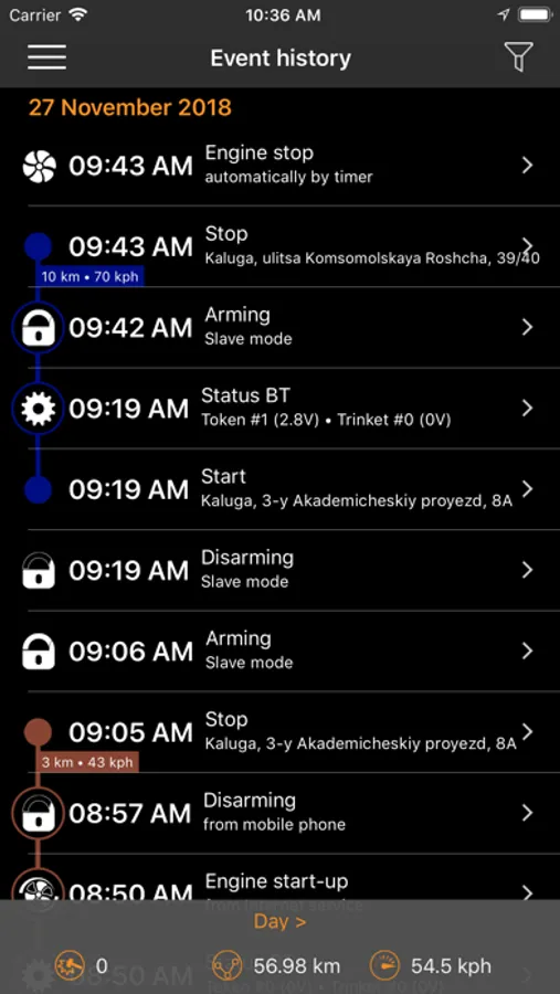 – History of driving, each track is accompanied by speed, duration and other information. You can use smart filters for track search.