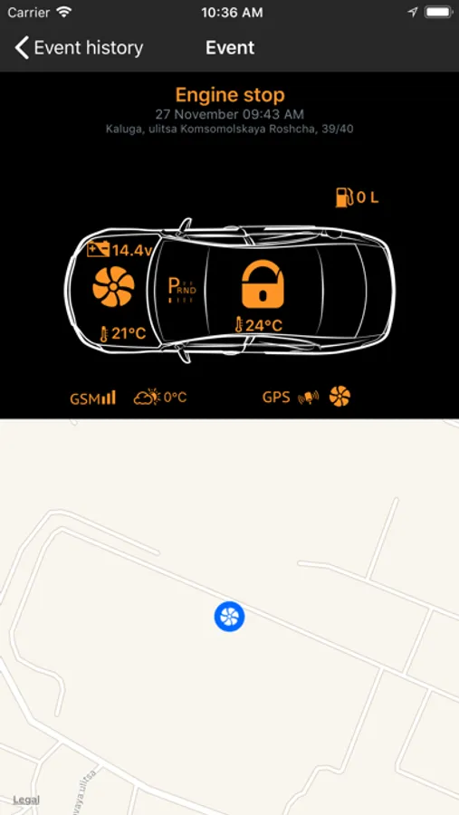 – Monitoring the current state of your car: statuses of all security zones and sensors, current fuel level (it depends on connections), engine temperature, car interior temperature, outside temperature (additional sensor is required), current car location (for systems with a GPS/GLONASS-receiver).