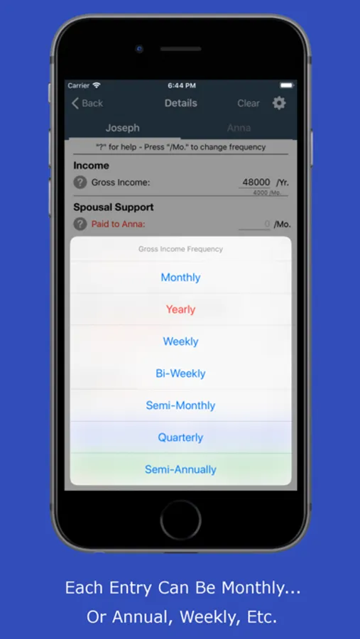 Each entry amount defaults to "monthly" amounts, but you can select other frequencies such as annual, weekly, bi-weekly, etc.