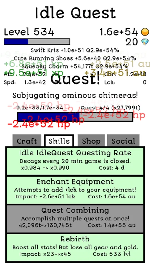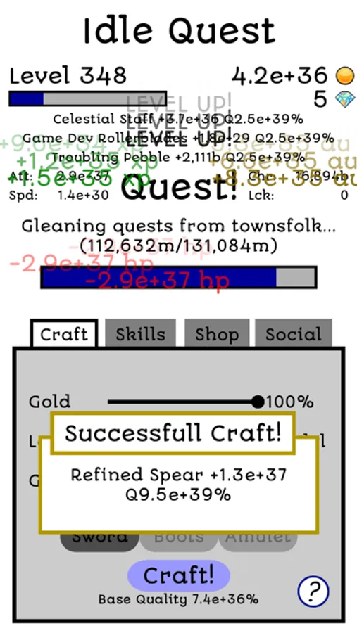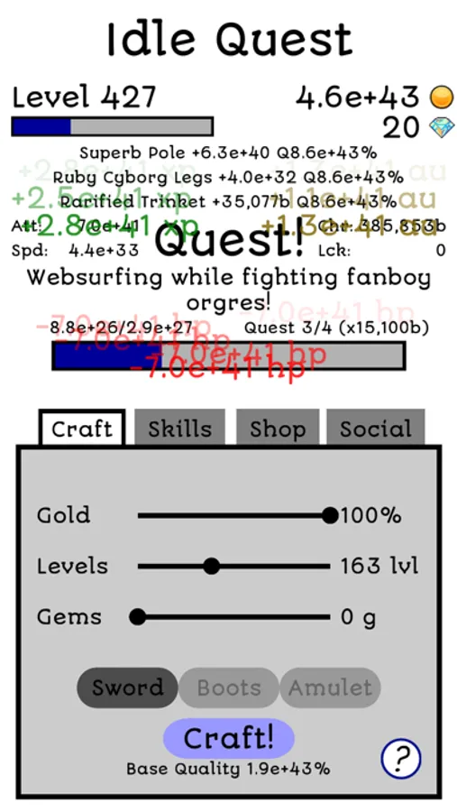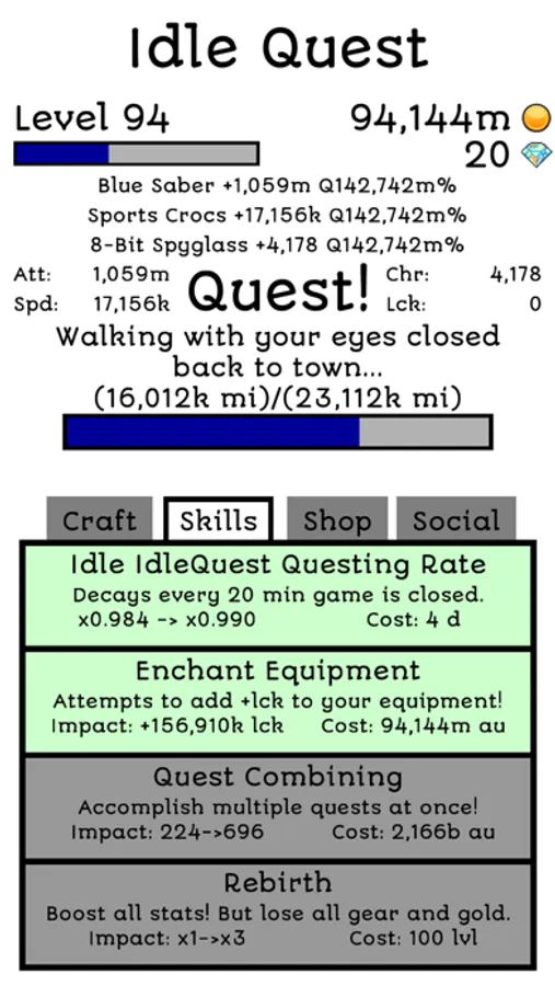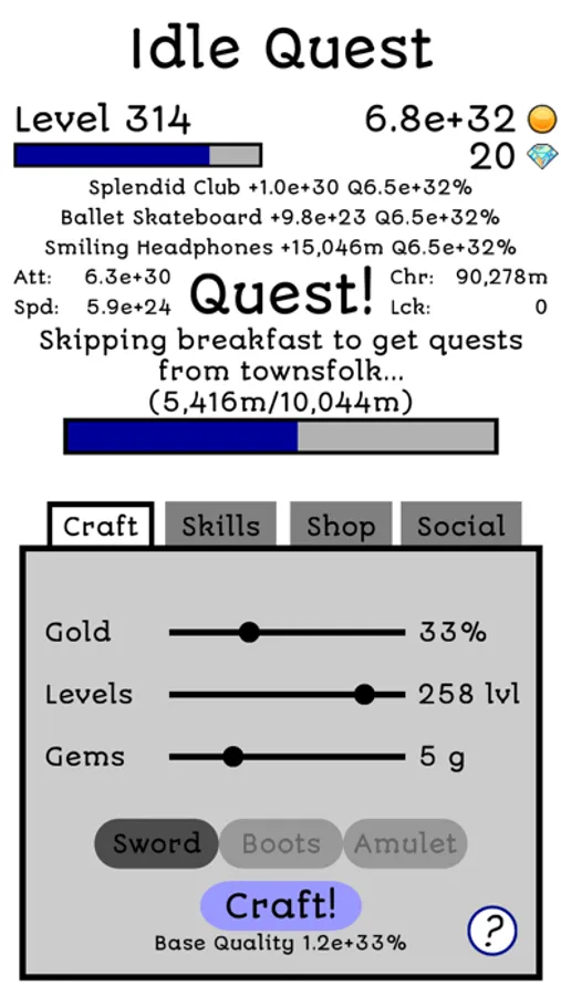 Questing! It's what we love, and it's what we do. Begin by getting quests from townsfolk. Then, scurry to the designated questing location with the footgear of your choice. Once there, slay the needed monsters with a flip of your sword, and return to town. Charm the townsfolk with your magical amulet and collect massive piles of gold! Use your newfound loot to craft new gear, letting you tackle with ease the next challenging quest...