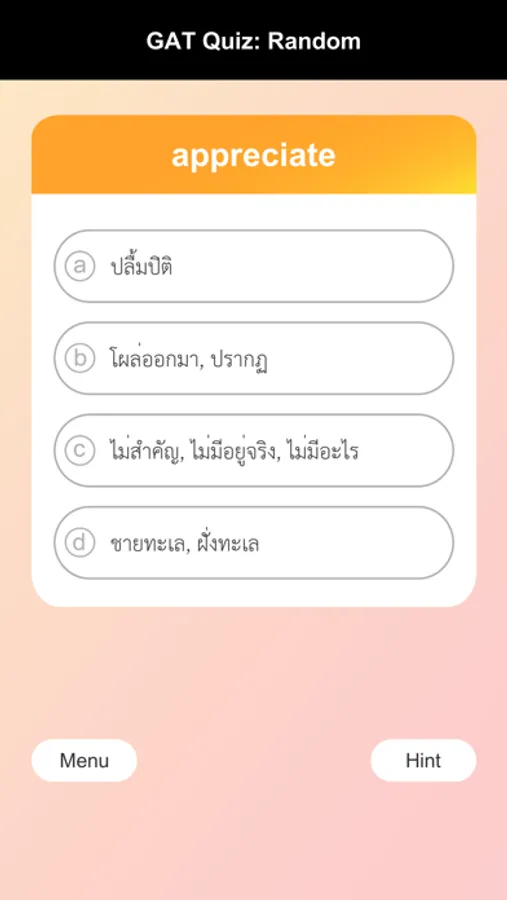 English-Thai Vocabulary Quiz for GAT : total 3,000 words from past GAT exam and M4-5-6 English syllabus. Help you to remember vocabulary for preparing your exam.