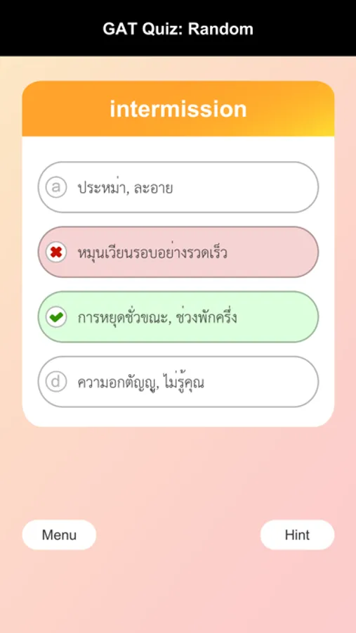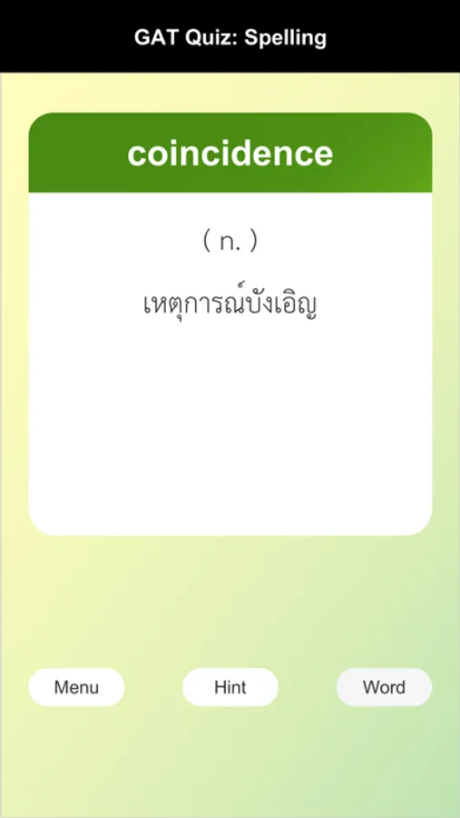 English-Thai Vocabulary Quiz for GAT แบบทดสอบคำศัพท์ อังกฤษ-ไทย แนวศัพท์ GAT ที่รวบรวมศัพท์จากข้อสอบเก่าเข้ามหาวิทยาลัย (GAT) และจากแบบเรียนตามหลักสูตรระดับชั้นมัธยมปลาย(4-5-6) 3,000 คำ ช่วยเตรียมความพร้อมสอบเข้ามหาวิทยาลัย และสอบระดับชั้นมัธยมปลาย พร้อมด้วย สัตว์เลี้ยงดิจิตอล ที่จะช่วยสนับสนุนการเรียนของคุณ