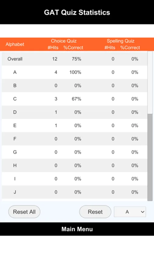 Statistic สถิติแสดงจำนวนครั้งที่ทำแบบทดสอบ และ % ที่ทำถูก เพื่อให้คุณสามารถวิเคราะห์จุดอ่อนจุดแข็งของคุณ ในแต่ละพยัญชนะขึ้นต้นได้