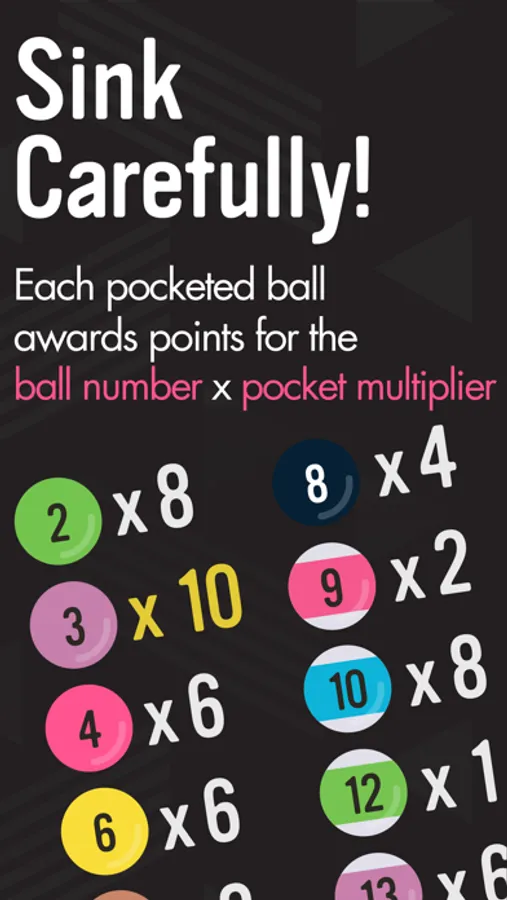 With each pocketed ball, you're awarded points based on the pocket you sunk. So sink carefully, but watch out, with each miss or scratch you lose a life — run out before you finish the table and it's game over.