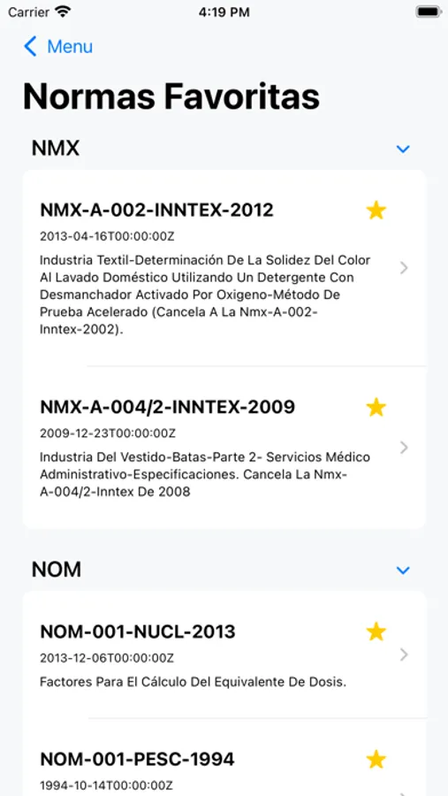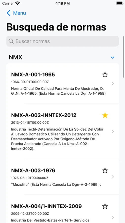 Aplicación no oficial de la Dirección General de Normas (DGN), con esta aplicación podrás consultar las normas oficiales mexicanas, normas mexicanas, revisar trámites y servicios ofrecidos por la DGN, busqueda de normas por criterios o palabra; ademas de contar con un widget para acceder más rapido a las normas que marques como favoritas.