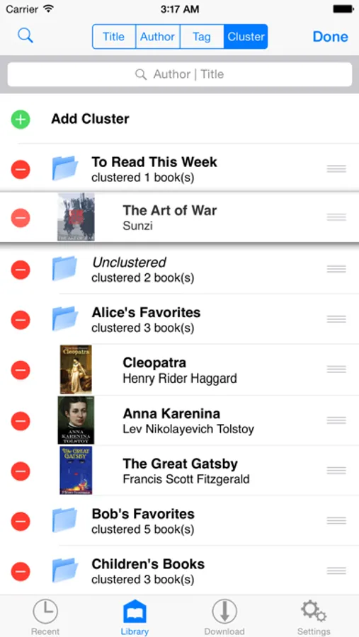 ⑤ Group books by clusters hierarchically in Library allowing adding/removing/editing of clusters and re-ordering of clusters and their books