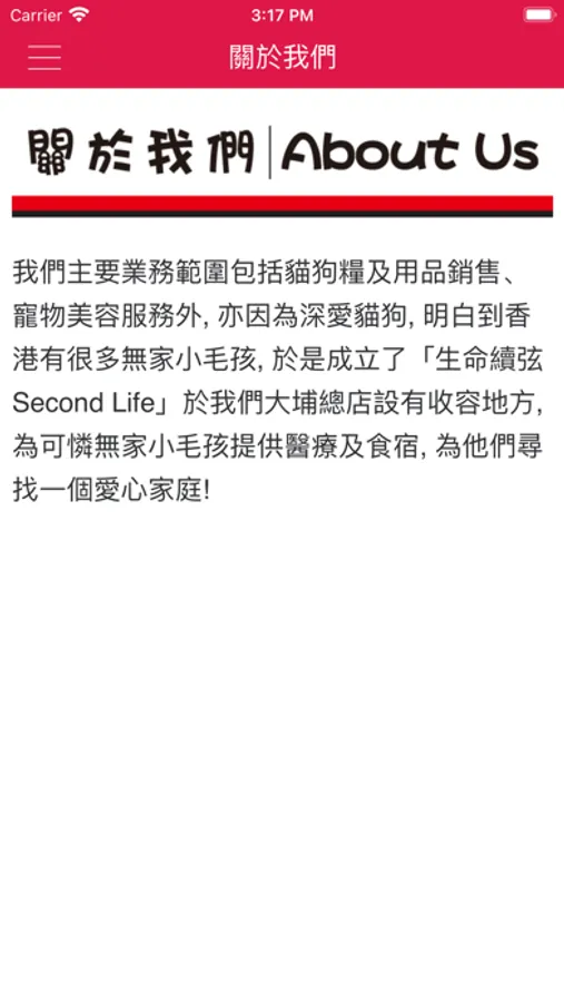 我們主要業務範圍包括貓狗糧及用品銷售、寵物美容服務外, 亦因為深愛貓狗, 明白到香港有很多無家小毛孩, 於是成立了「生命續弦 Second Life」於我們大埔總店設有收容地方, 為可憐無家小毛孩提供醫療及食宿, 為他們尋找一個愛心家庭!