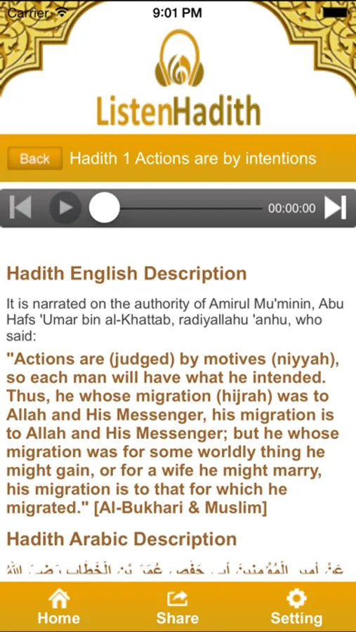 Listen Hadit brings you beautiful Hadiths, inspirational Ayahs and heart-warming Duas at your fingertips, in a unique manner, carefully selected and categorised for your own personal situations and listen the audio in arabic and english.