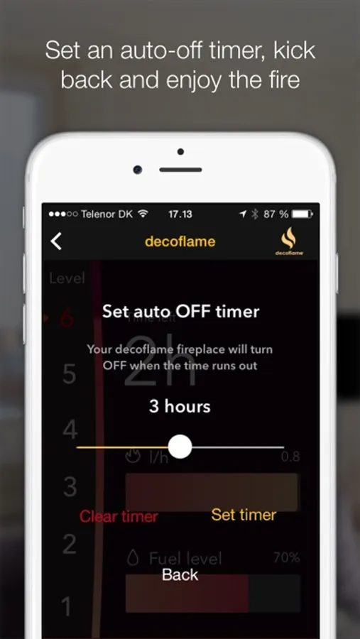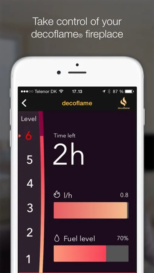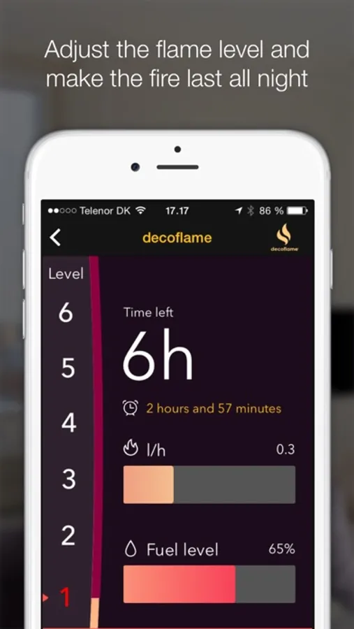 With the Decoflame® app you can turn on/off your fireplace, and adjust the flame level to fit your needs. You can see how much fuel that is left in the tank, and for how long the fireplace will be able to burn at the current flame level before running out of fuel.
