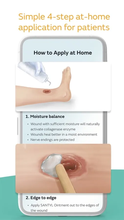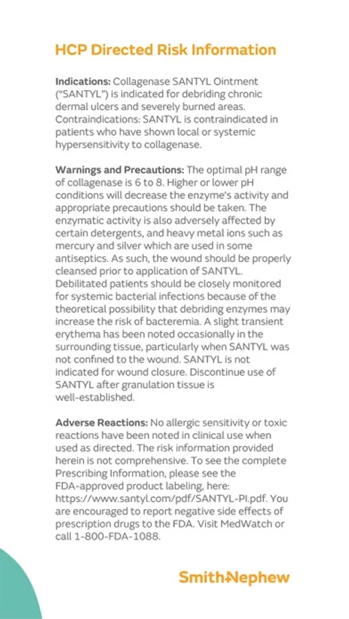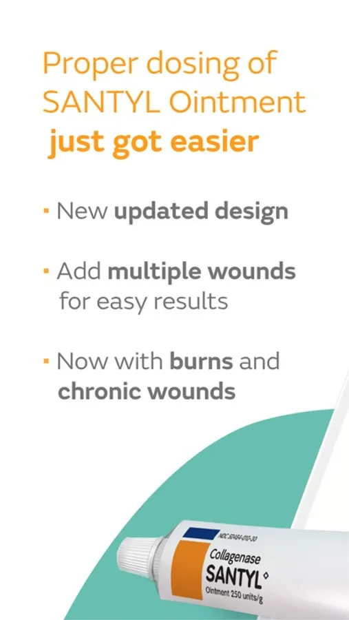 The Collagenase SANTYL◊ Ointment dosing calculator helps healthcare professionals quickly estimate the proper amount (in grams) needed to prescribe for their patients. The 4-step protocol for proper application is also included. Please note that the estimates are only intended as a guide, contain rounded values where appropriate, and assume a constant wound size throughout the treatment period. Therefore, you should adjust these estimates based upon your own clinical experience and individual wound characteristics.