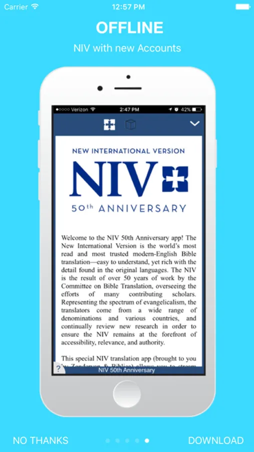 Welcome to the NIV 50th Anniversary app! The New International Version is the world’s most read and most trusted modern-English Bible translation—easy to understand, yet rich with the detail found in the original languages. The NIV is the result of over 50 years of work by the Committee on Bible Translation, overseeing the efforts of many contributing scholars. Representing the spectrum of evangelicalism, the translators come from a wide range of denominations and various countries, and continually review new research in order to ensure the NIV remains at the forefront of accessibility, relevance, and authority.