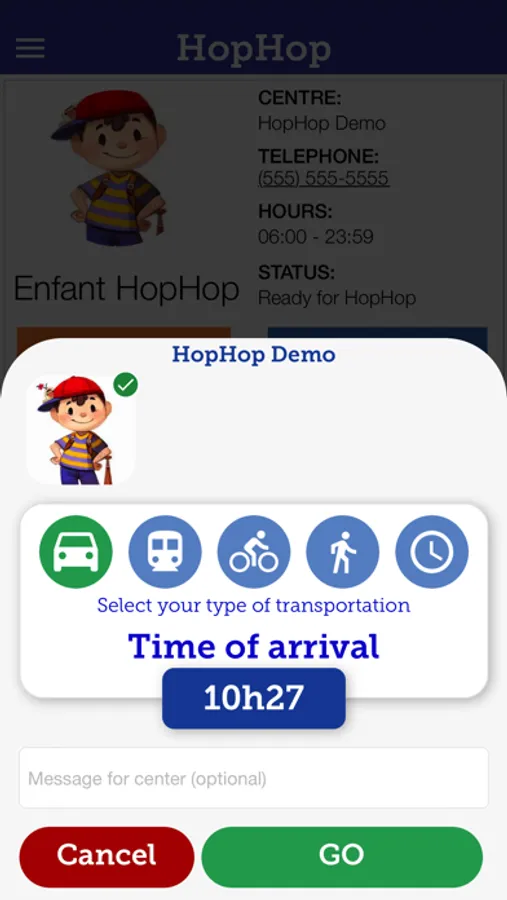 You click on HopHop when you leave for the daycare centre. The daycare receives the message only at the time necessary for your child to prepare. As an example, if the daycare centre determines that the children's preparation time is ten minutes, the HopHop server will manage to make your call appear only ten minutes from your arrival at the daycare.