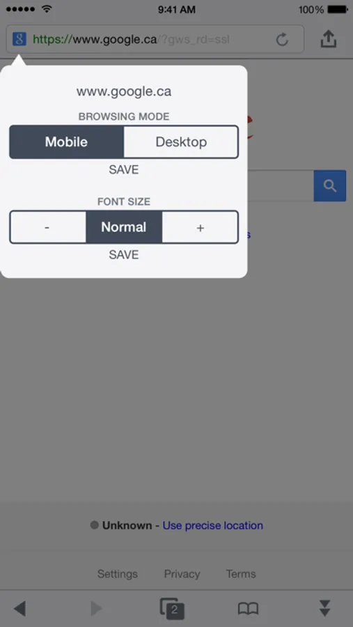 - Universal address bar: Get suggestions from history, bookmarks, tabs, and search from the address bar.