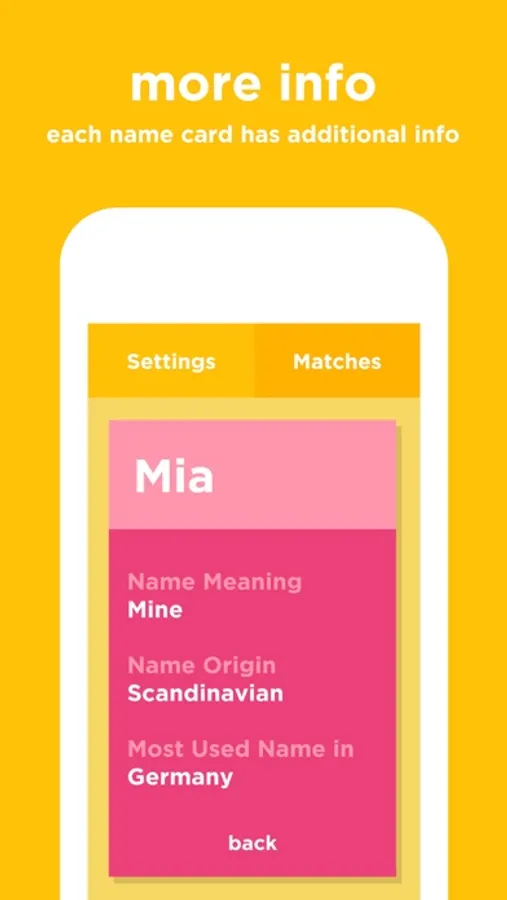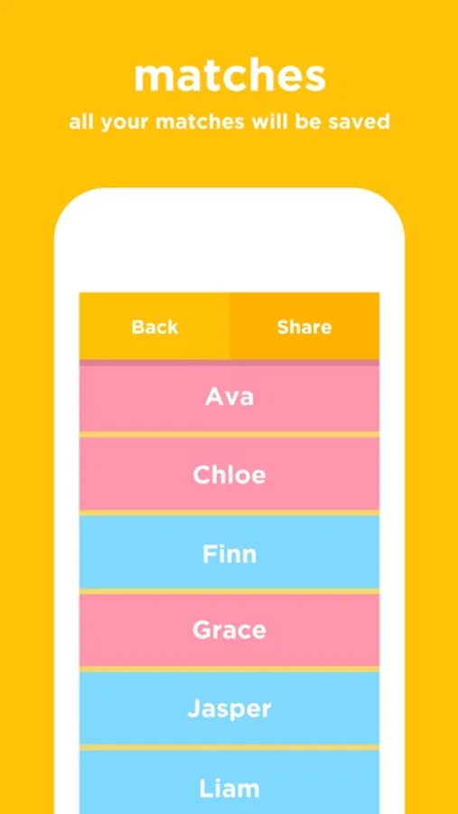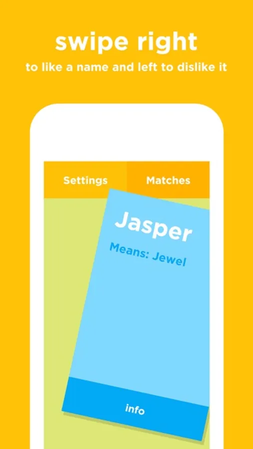 Connect with your partner and swipe through baby name cards together. If you both like the same name, it's a match and is added to your favorites list, so you'll never forget it. One name will last a lifetime.
