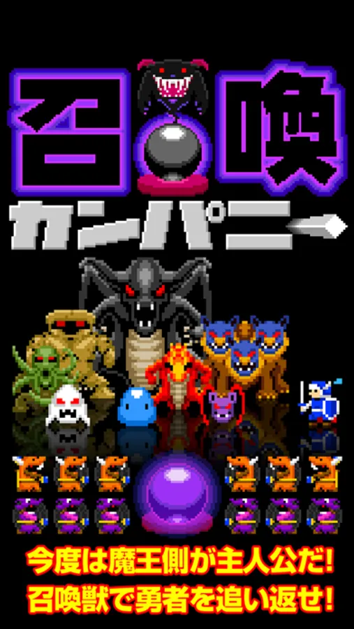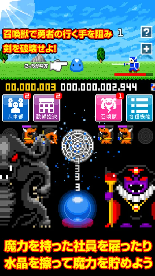 貯まった魔力で従業員を増やしたり設備投資を行ったり、そして勇者の行く手を阻む召喚獣を呼び起こすことができます。