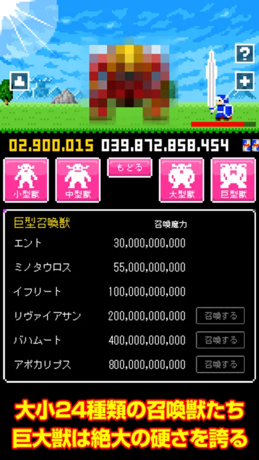 召喚獣はスライムからバハムートまで大小24種類×覚醒モードの合計48種類。