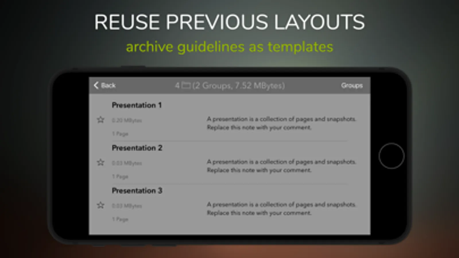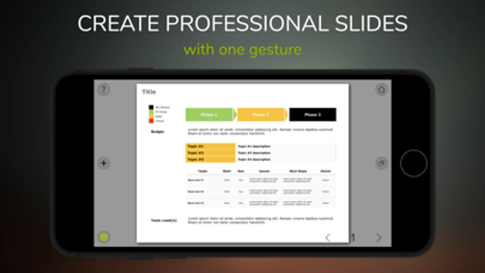 Creating presentations on a mobile device can sometimes be problematic. Particularly during transits (on a train, during flights, etc.). This app solves the issue with slides already tuned for a professional meeting. Select which one fits the best, and add additional content if needed.