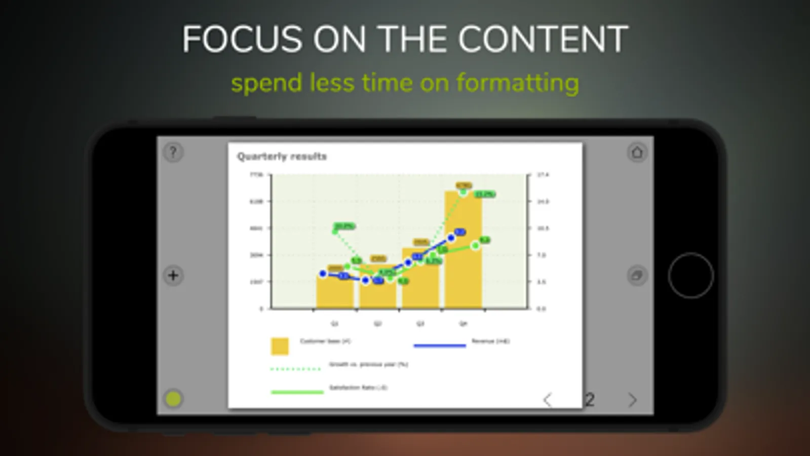 You add the content, and we will take care of the formatting. Create professional presentations in no time with predefined (customizable) templates.