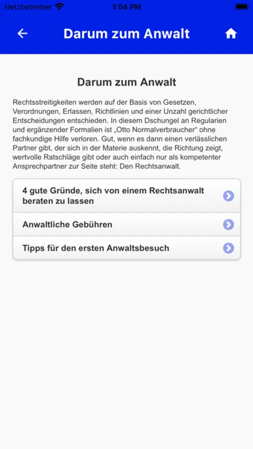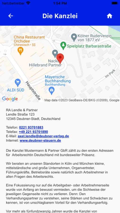 Und mit dieser App haben Sie Ihren Anwalt immer in der Tasche und einen direkten Draht zur Kanzlei. Sollten Sie anwaltlichen Rat benötigen, finden Sie hier sämtliche Kontaktdaten inkl. komfortabler Wegbeschreibung.